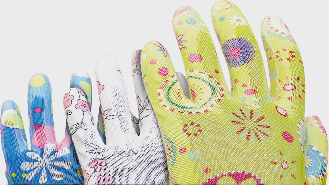 Ladies Floral Gardening Gloves (3 Pack) - Nitrile Coated Water-Resistant Work Gloves - Thorn Resistant Grip for Weeding, Pruning & Wet Soil - Breathable Knit